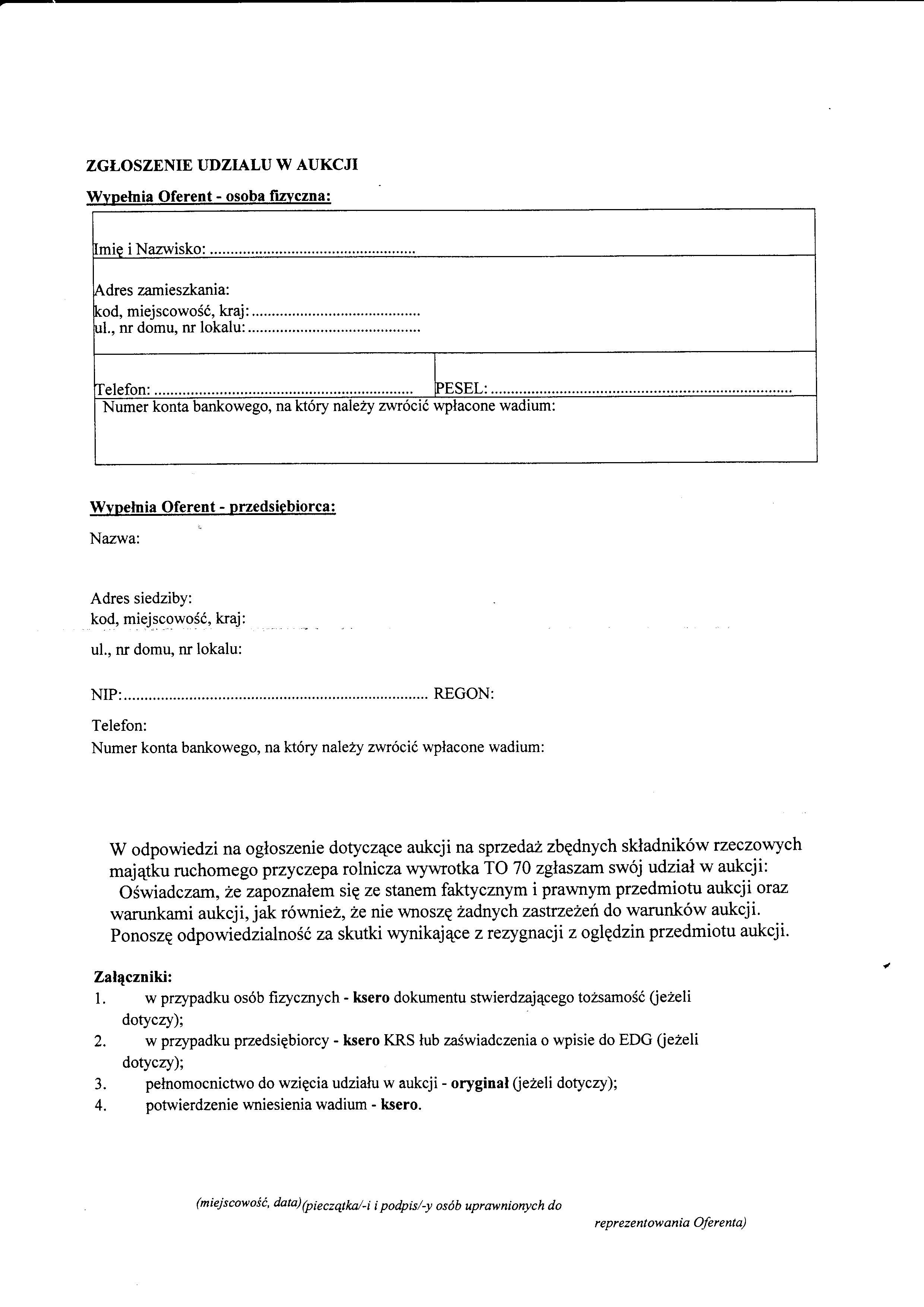 Dworska 4 celem wypełnienia i złożenia Zgłoszenia udziału w przetargu, którego wzór